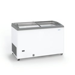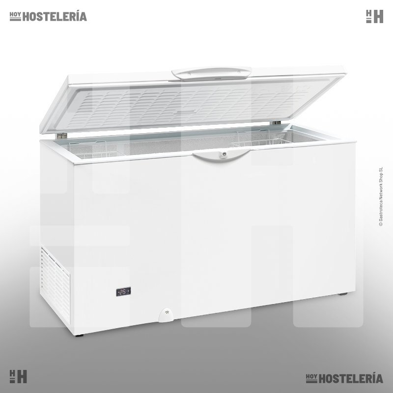 Arcón de congelación de 117 cm., adecuado para conservación de congelados, con 324 litros de capacidad, puerta abatible ciega, control digital de temperatura, acabado exterior blanco y cestillos de varilla plastificada (opcionales).