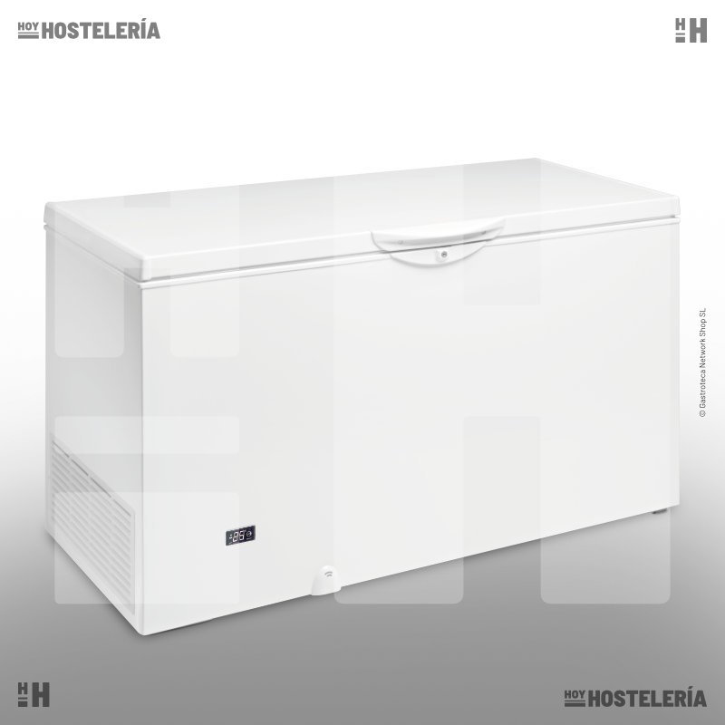 Arcón de congelación de 140 cm., adecuado para conservación de congelados, con 402 litros de capacidad, puerta abatible ciega, control digital de temperatura, acabado exterior blanco y cestillos de varilla plastificada (opcionales).