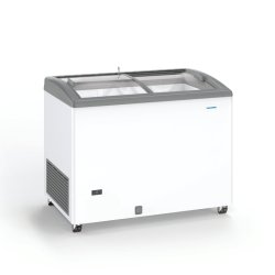 Arcón congelador, adecuado para conservación de helados y congelados, con 376 litros de capacidad, puertas correderas ciegas, acabado exterior e interior blanco, y control manual de temperatura.