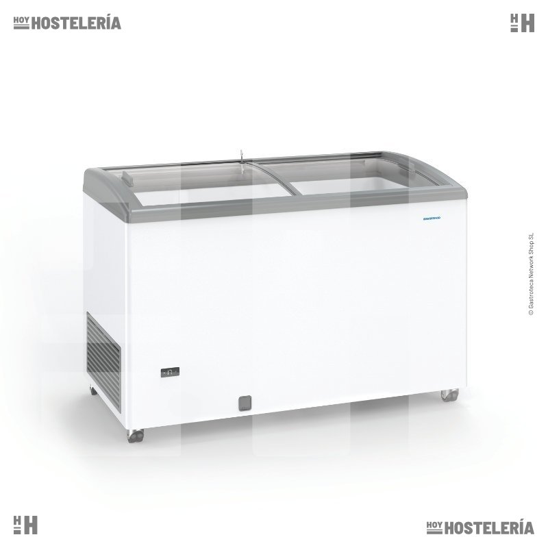 Arcón congelador indicado para la conservación de congelados, con 305 litros de capacidad, marco inyectado de color gris con perfil inclinado, puertas correderas de cristal curvo, acabado exterior e interior en color blanco, control electrónico y luz LED interior opcional.