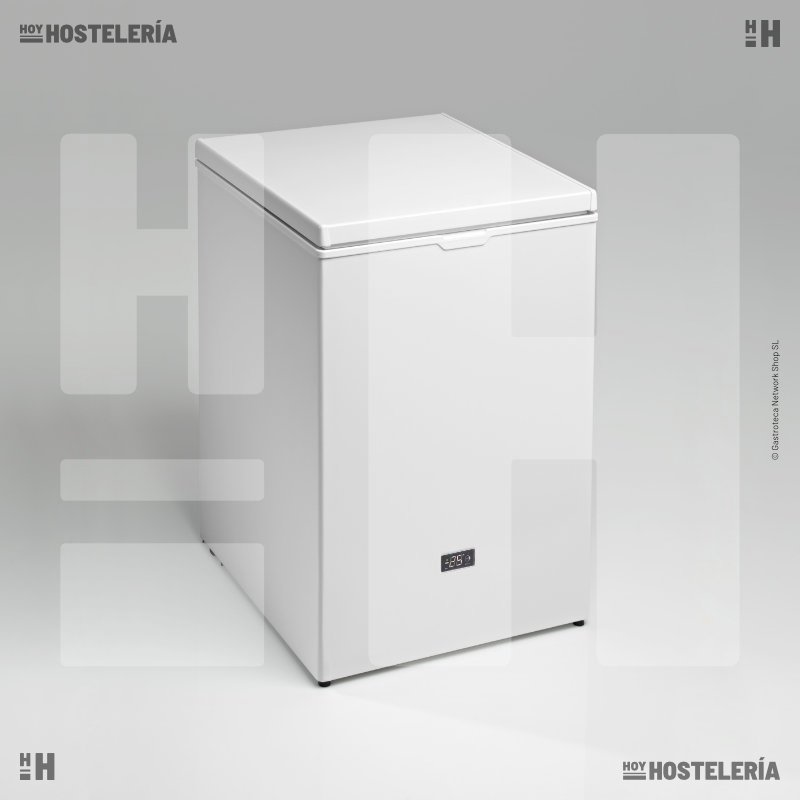 Arcón para conservación de congelados, con 102 litros de capacidad, puerta abatible ciega y control digital de temperatura.
