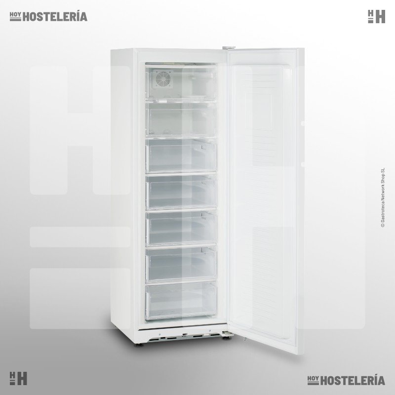 Congelador vertical con 5 cajones y 2 estantes superiores cerrados con tapa basculante.