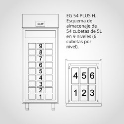 — Dotación EG 54 PLUS H: 9 estantes de rejilla 530x735mm, con guías.