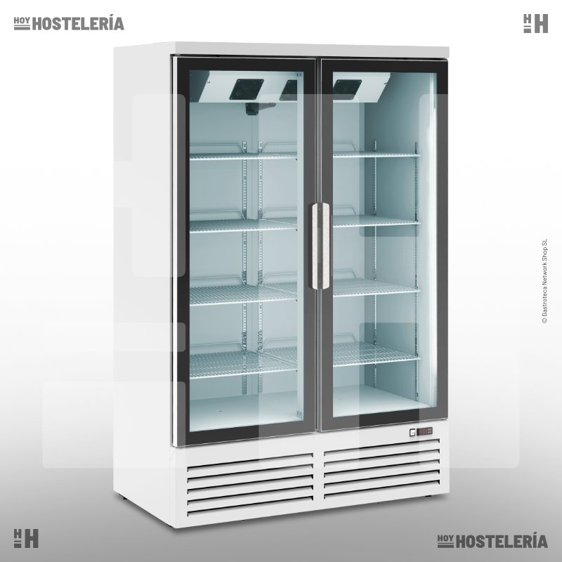 Armario expositor de congelación y refrigeración de doble puerta, con 686 litros de capacidad, 4 niveles por puerta, puertas batientes de cristal templado y tirador integrado, control digital e iluminación interior LED. Recomendado para productos de pastelería y heladería.
