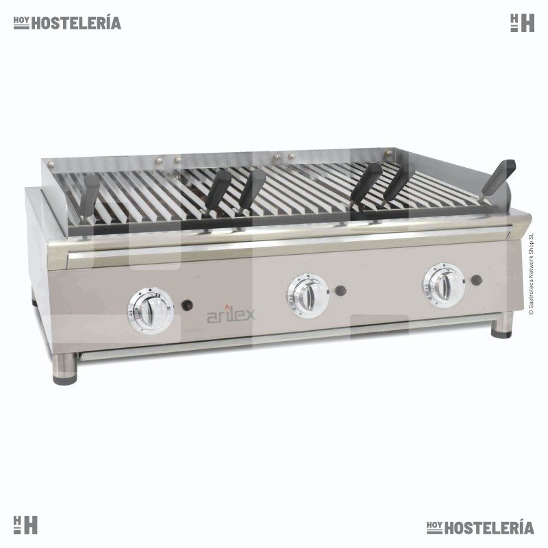 La parrilla vasca 100VASN de Arilex es una barbacoa de gas con piedra volcánica de 100 cm. de anchura y peto de 10cm. La parrilla acanalada de acero inoxidable es inclinable y se puede ajustar a 3 posiciones. De serie, se suministra preparada para gas propano/butano, adaptable a gas natural mediante el cambio de inyectores (incluidos) y del porta-gomas. Acabado exterior en acero inoxidable. Dotación: 3 bolsas de 3kg de piedra volcánica.
