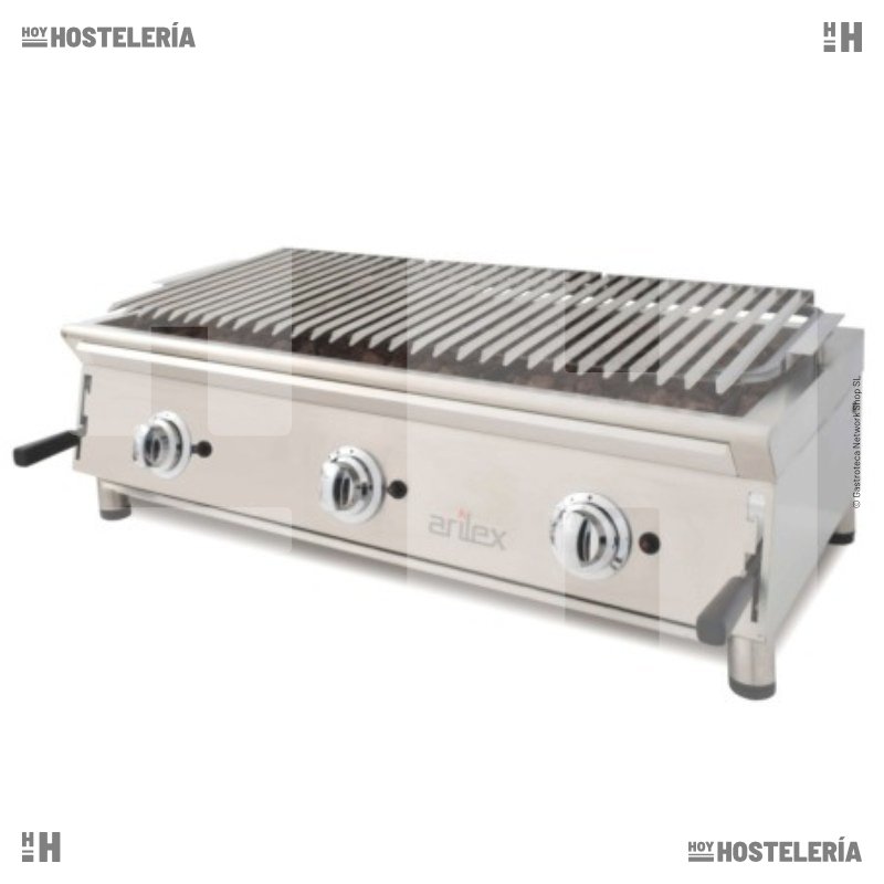 La barbacoa 100BAR de Arilex es una barbacoa elevable de gas con piedra volcánica, de 100 cm. de anchura. La parrilla acanalada está disponible en acero inoxidable; es regulable y se puede ajustar a 3 alturas. De serie, se suministra preparada para gas propano/butano, adaptable a gas natural mediante el cambio de inyectores (incluidos) y del porta-gomas. Acabado exterior en acero inoxidable. Dotación: 3 bolsas de 3kg de piedra volcánica.