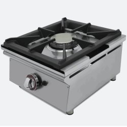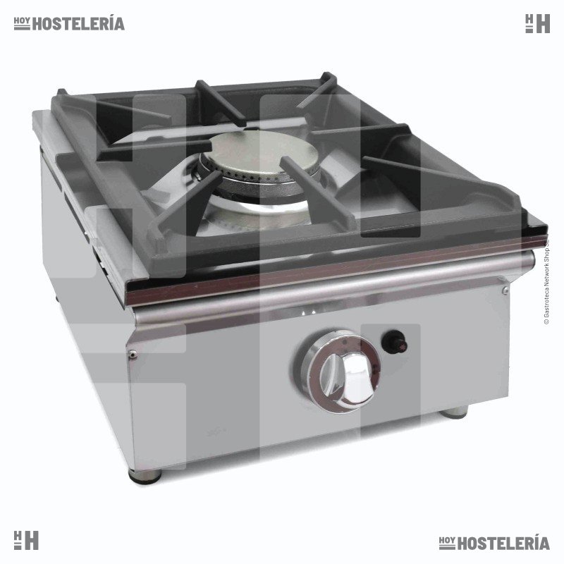 Cocina profesional a gas de sobremesa, con 1 fogón con termopar y una superficie útil de cocción de 400x400mm. Toma de gas por la parte trasera que facilita la instalación en sitios donde el aprovechamiento del espacio es esencial. De serie, se suministra preparada para gas propano/butano, adaptable a gas natural mediante el cambio de inyectores (incluidos) y del porta-gomas. Acabado exterior en acero inoxidable brillante.