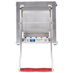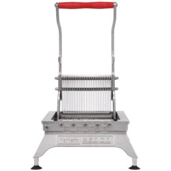 Rebanadora manual de sobremesa 403NH de Pujadas Vollrath para frutas y verduras. Está construida con un sólido cuerpo de aluminio, en el que se insertan las cuchillas, e incorpora un bloque empujador con asa para presionar el producto contra las cuchillas, y guías que se insertan entre las cuchillas. Integra la cuchilla 485 de 28 hojas con filo de alta precisión que cortan la fruta, en un solo movimiento, en rodajas de 6,4 mm de espesor.