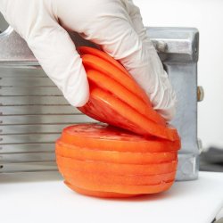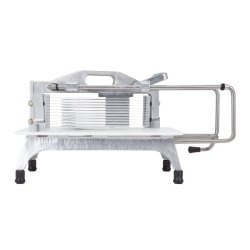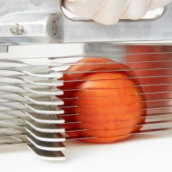 Cortadora manual de sobremesa TOMATO PRO™ de Pujadas Vollrath para cortar tomates (y otras hortalizas y frutas) de hasta 80 mm de diámetro en rodajas uniformes de 6,4 mm con un solo movimiento. Está construida con un sólido cuerpo de aluminio, base de corte se polietileno con certificación NFS y cuchillas de acero. Disponible con protector de seguridad opcional. Hasta 5 veces más rápido que el corte a cuchillo. Cuchilla de 15 hojas y corte de 4,8 mm opcional (consultar).