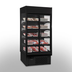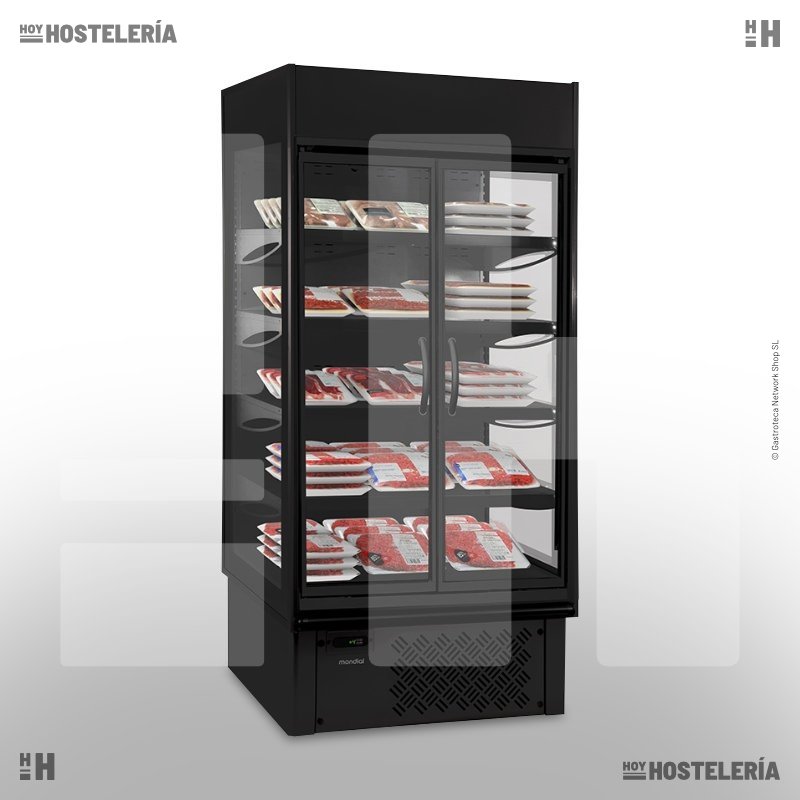Mural refrigerado con puertas abatibles de 601 litros, concebido especialmente para la conservación y exposición de carnes, pescados, bebidas, sandwiches, embutidos, lácteos y otros productos en servicio Take-Away.