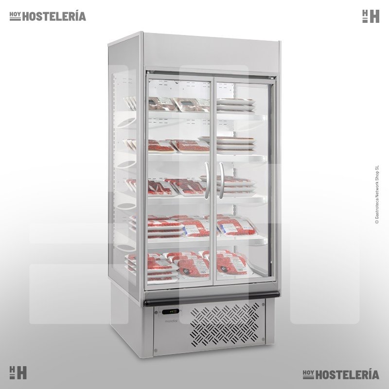Mural refrigerado con puertas abatibles de 601 litros, concebido especialmente para la conservación y exposición de carnes, pescados, bebidas, sandwiches, embutidos, lácteos y otros productos en servicio Take-Away.