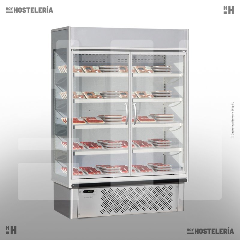 Mural refrigerado con puertas abatibles de 825 litros, concebido especialmente para la conservación y exposición de carnes, pescados, bebidas, sandwiches, embutidos, lácteos y otros productos en servicio Take-Away.