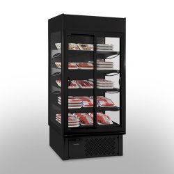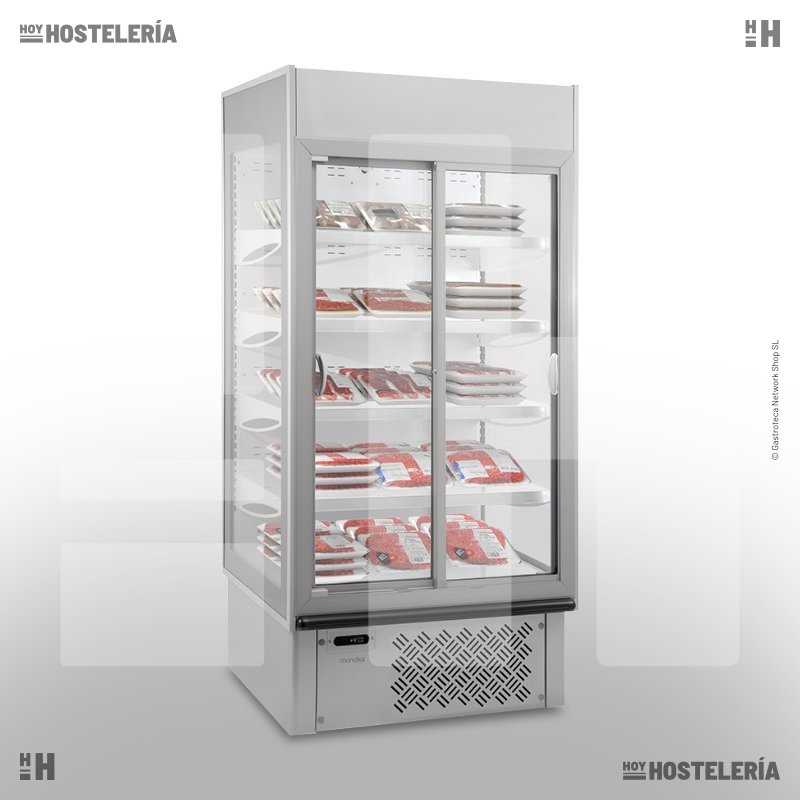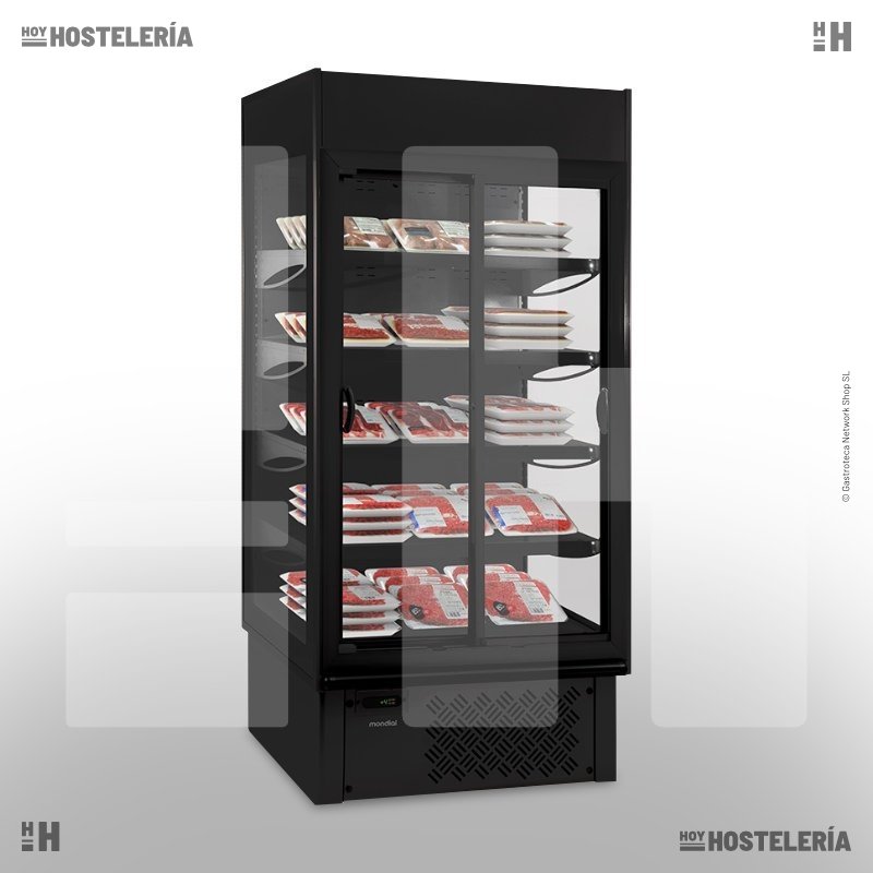 Mural refrigerado con puertas correderas de 601 litros, concebido especialmente para la conservación y exposición de carnes, pescados, bebidas, sandwiches, embutidos, lácteos y otros productos en servicio Take-Away.