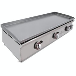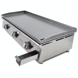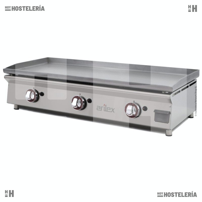 Plancha a gas con placa de cocción de 1000x400mm, fabricada en acero laminado de 6mm de espesor con peto de 36mm de altura. Incorpora quemadores diseño ARILEX, con salida de llama por todo su perímetro que asegura un reparto uniforme de calor por toda la placa (sin “zonas frías”). Toma de gas por la parte trasera que facilita la instalación en sitios donde el aprovechamiento del espacio es esencial. De serie, se suministra preparada para gas propano/butano, adaptable a gas natural mediante el cambio de inyectores (incluidos) y del porta-gomas. Acabado exterior en acero inoxidable.