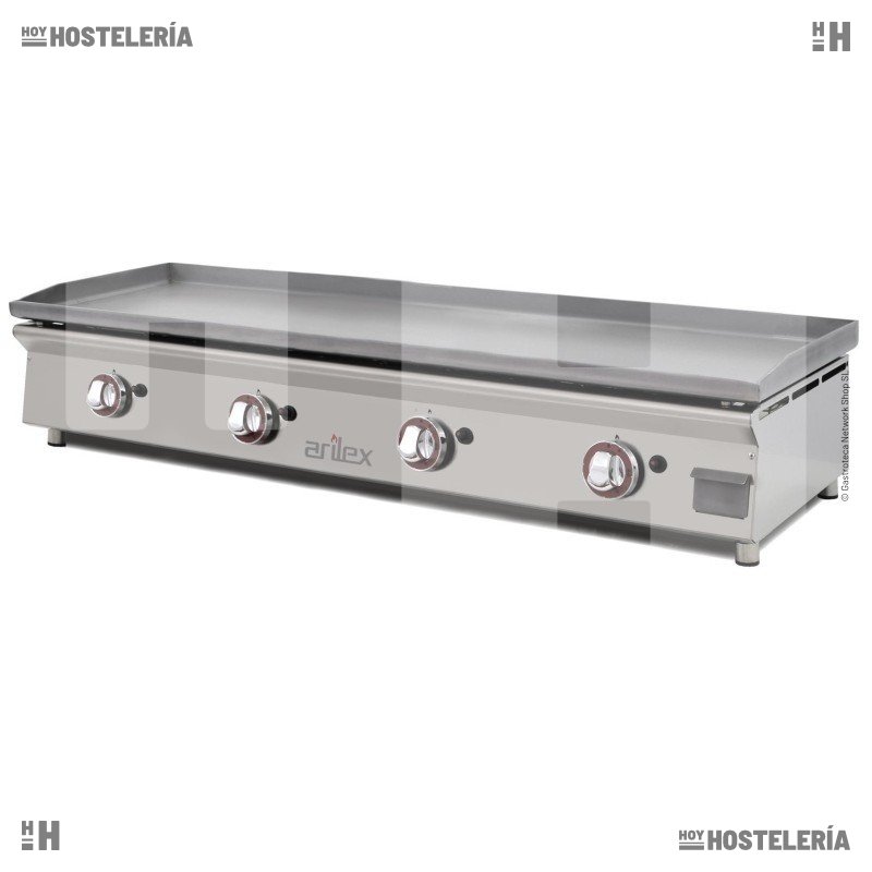Plancha a gas con placa de cocción de 1200x400mm, fabricada en acero laminado de 6mm de espesor con peto de 36mm de altura. Incorpora quemadores diseño ARILEX, con salida de llama por todo su perímetro que asegura un reparto uniforme de calor por toda la placa (sin “zonas frías”). Toma de gas por la parte trasera que facilita la instalación en sitios donde el aprovechamiento del espacio es esencial. De serie, se suministra preparada para gas propano/butano, adaptable a gas natural mediante el cambio de inyectores (incluidos) y del porta-gomas. Acabado exterior en acero inoxidable brillante.