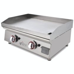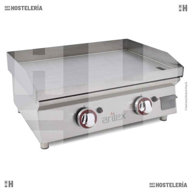 Plancha a gas con placa de cocción de 600x400mm, fabricada en acero rectificado de 15mm de espesor con peto soldado de 80mm de altura y 3mm de espesor. Incorpora quemadores diseño ARILEX, con salida de llama por todo su perímetro que asegura un reparto uniforme de calor por toda la placa (sin “zonas frías”). Toma de gas por la parte trasera que facilita la instalación en sitios donde el aprovechamiento del espacio es esencial. De serie, se suministra preparada para gas propano/butano, adaptable a gas natural mediante el cambio de inyectores (incluidos) y del porta-gomas. Acabado exterior en acero inoxidable.