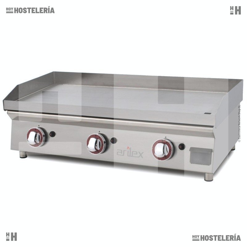 Plancha a gas con placa de cocción de 800x400mm, fabricada en acero rectificado de 15mm de espesor con peto soldado de 80mm de altura y 3mm de espesor. Incorpora quemadores diseño ARILEX, con salida de llama por todo su perímetro que asegura un reparto uniforme de calor por toda la placa (sin “zonas frías”). Toma de gas por la parte trasera que facilita la instalación en sitios donde el aprovechamiento del espacio es esencial. De serie, se suministra preparada para gas propano/butano, adaptable a gas natural mediante el cambio de inyectores (incluidos) y del porta-gomas. Acabado exterior en acero inoxidable .