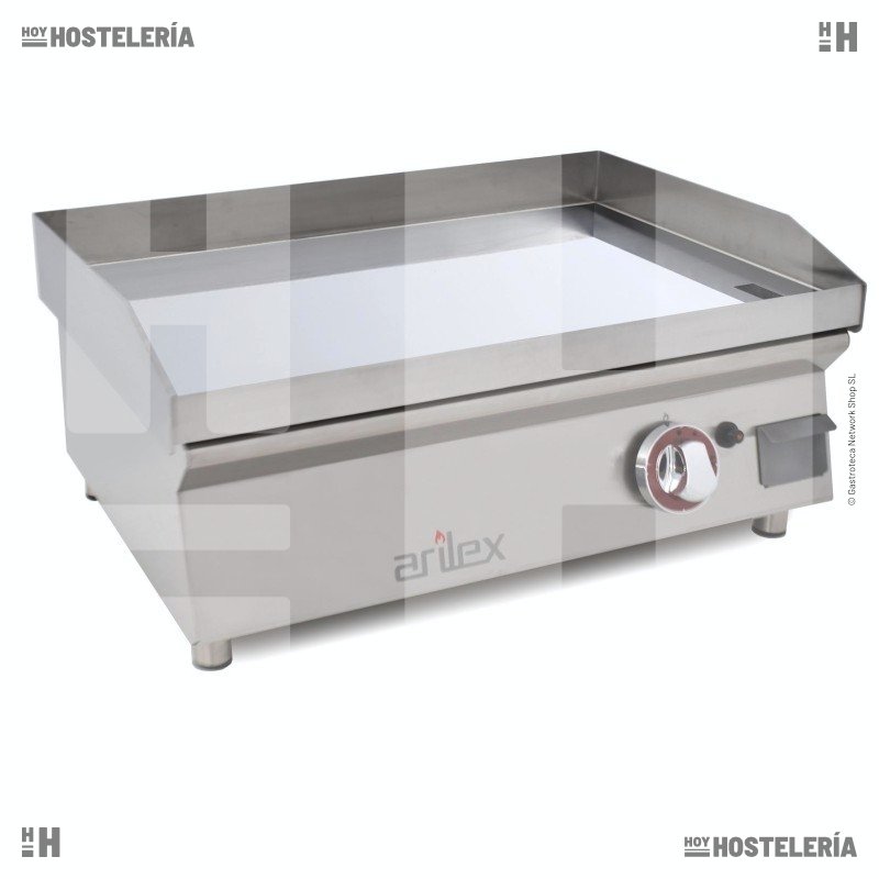 Plancha a gas con placa de cocción de 600x400mm, fabricada en acero de 15mm de espesor con baño de cromo duro de 50 micras, con peto soldado de 80mm de altura y 3mm de espesor. Incorpora quemadores diseño ARILEX, con salida de llama por todo su perímetro que asegura un reparto uniforme de calor por toda la placa (sin “zonas frías”). Toma de gas por la parte trasera que facilita la instalación en sitios donde el aprovechamiento del espacio es esencial. De serie, se suministra preparada para gas propano/butano, adaptable a gas natural mediante el cambio de inyectores (incluidos) y del porta-gomas. Acabado exterior en acero inoxidable brillante.