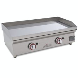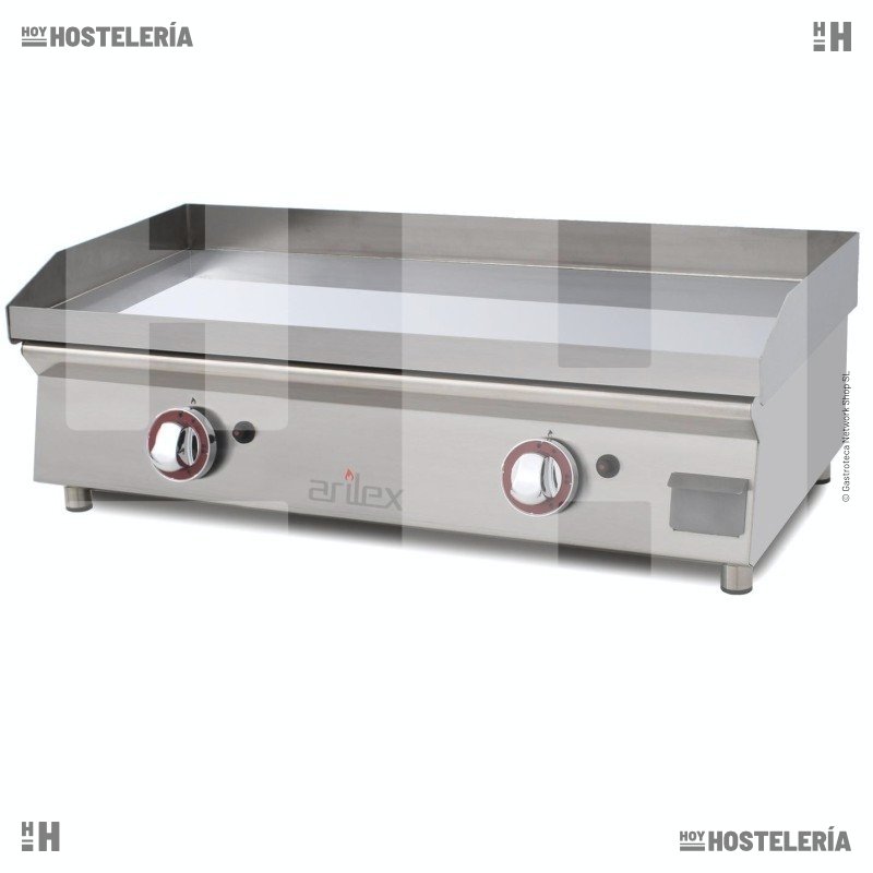 Plancha a gas con placa de cocción de 800x400mm, fabricada en acero de 15mm de espesor con baño de cromo duro de 50 micras, con peto soldado de 80mm de altura y 3mm de espesor. Incorpora quemadores diseño ARILEX, con salida de llama por todo su perímetro que asegura un reparto uniforme de calor por toda la placa (sin “zonas frías”). Toma de gas por la parte trasera que facilita la instalación en sitios donde el aprovechamiento del espacio es esencial. De serie, se suministra preparada para gas propano/butano, adaptable a gas natural mediante el cambio de inyectores (incluidos) y del porta-gomas. Acabado exterior en acero inoxidable.