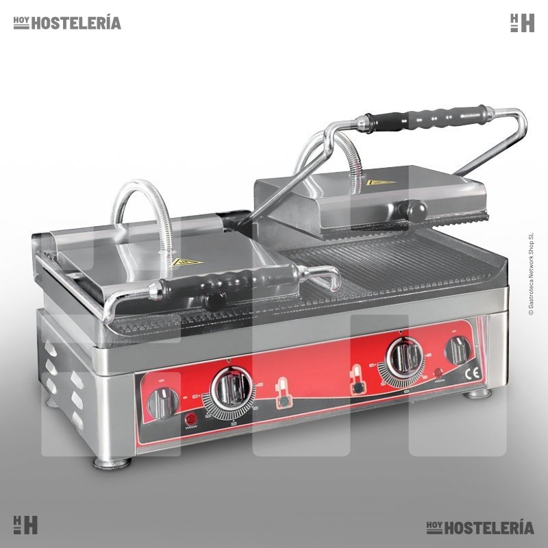 Doble grill de contacto eléctrico profesional con estructura de acero inox, 2 planchas superiores independientes estriadas y 1 plancha inferior doble (lisa, estriada o estriada-lisa) de 52x24cm. con revestimiento cerámico a prueba de ácido, sal y corrosión. Máquinaria de cocción adecuada para la preparación de sandwiches, bocadillos, carnes y vegetales.