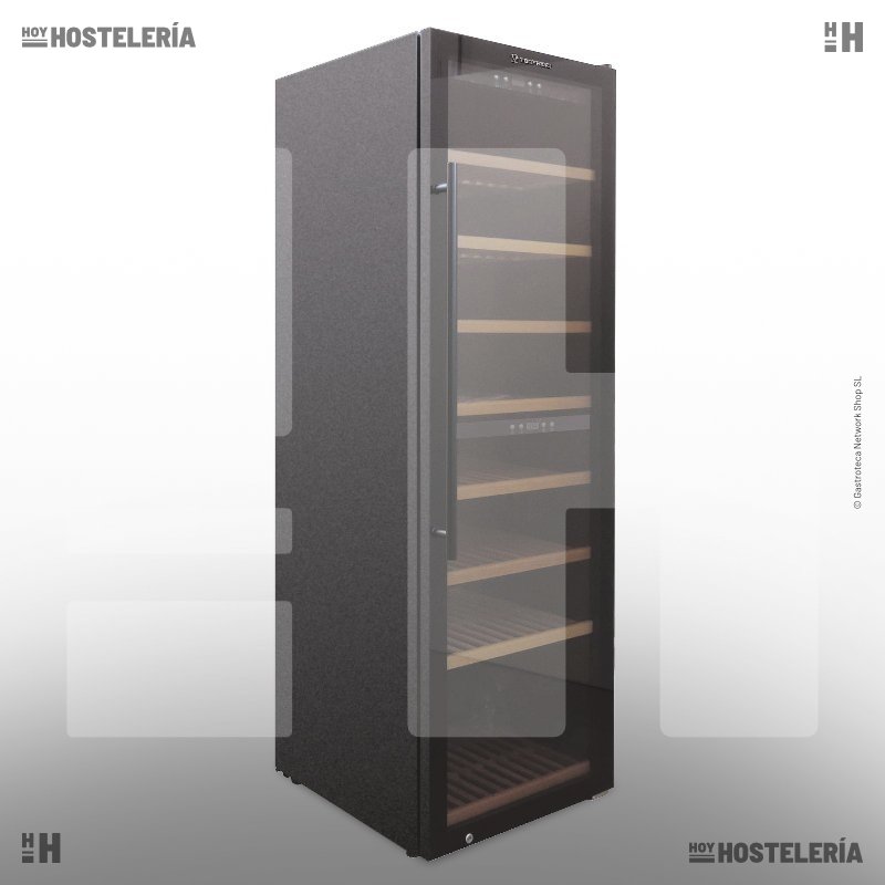 Armario de vino dual Sommelier 482 FG de Tecfrigo, con 2 zonas de temperatura independientes para mantener diferentes tipos de vino. Tiene una capacidad para almacenar hasta 163 botellas distribuidas en 8 estantes deslizantes de madera. Mantiene los vinos en un ambiente controlado y óptimo para el servicio.