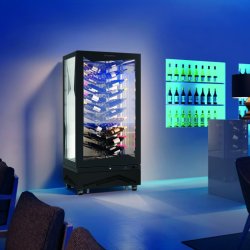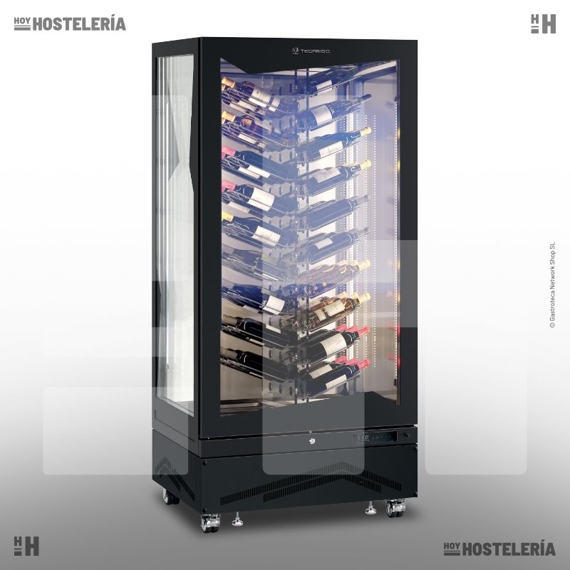 Vitrina expositora de 4 caras de cristal para vino, Marilyn 651 Wine Vision de Tecfrigo. Tiene capacidad para 114 botellas, distribuidas en 57 soportes de varilla metálica y 57 orificios en el panel medianero de metacrilato, en los que se insertan las botellas por el cuello. Cuenta con 650 litros de capacidad, puerta con tirador integrado y cierre con llave, control digital e iluminación interior LED.