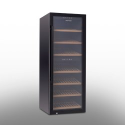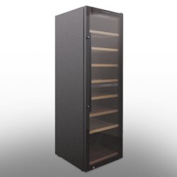 Armario de vino refrigerado con capacidad para 264 botellas distribuidas en 6 niveles: 5 estantes de rejilla con frontal de madera + base, puerta batiente con doble cristal templado, filtro de carbón activo, termómetro analógico y control mecánico de temperatura.