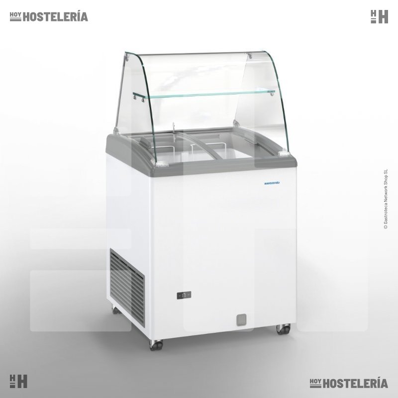 Vitrina tipo arcón para conservar y exponer helado con capacidad para 3 cubetas de 5 litros alojadas en los cestillos de varilla plastificada incluidos, ámplia reserva en nivel inferior, cúpula de cristal templado, puertas corredera de cristal con cerradura, ruedas pivotantes y Termostato digital.
