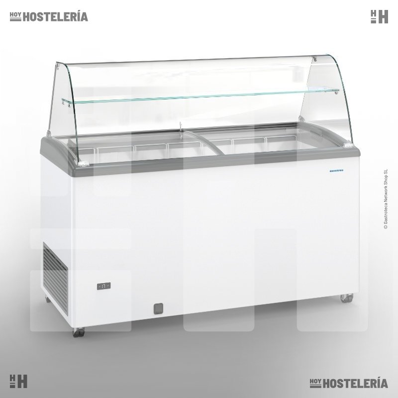 Vitrina tipo arcón para conservar y exponer helado con capacidad para 10 cubetas de 5 litros y 1 cubeta de 2,5L alojadas en los cestillos de varilla plastificada incluidos, ámplia reserva en nivel inferior, cúpula de cristal templado, puertas corredera de cristal con cerradura, ruedas pivotantes y termostato digital.